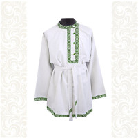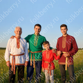 Косоворотка украшена жаккардовой тесьмой и вьюнком, контрастирующей по цвету с основной тканью. В комплекте с изделием идет кушак.