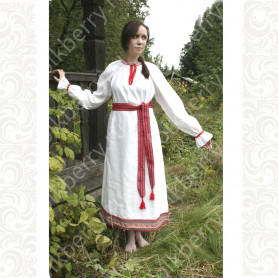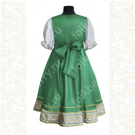 Приталенная модель хорошо сидит по фигуре, расклешенная книзу дает крупные мягкие волны. Сзади расположена застежка «молния». Талия дополнительно подчеркивается поясом. Плечики регулируются по длине. Сарафан украшен широкой полосой из жаккардовой тесьмы, вьюнка, золотистого шнура, кружева.