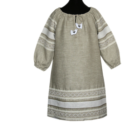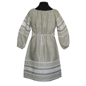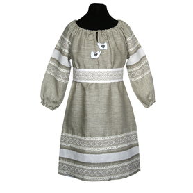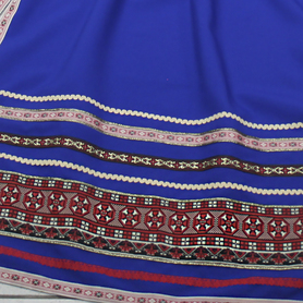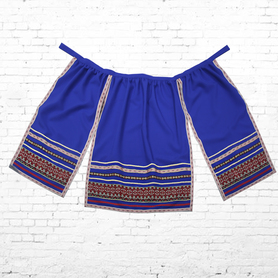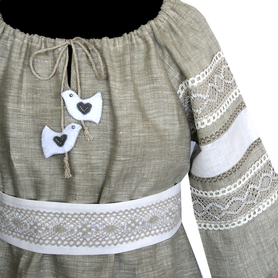 Платье  нежного красивого голубого цвета универсальное, т.к. хорошо садится по фигуре, благодаря регулируемой горловине, рукаву реглан, наличию длинного пояса.  Юбка (почти солнце) длиной немного ниже колена эффектно смотрится в танце. Талия слегка завышена. Декор платья - жаккардовая тесьма с обережными символами. Платье сшито из габардина, матовой, немнущейся ткани ярких цветов.