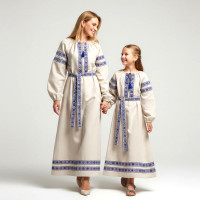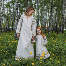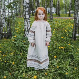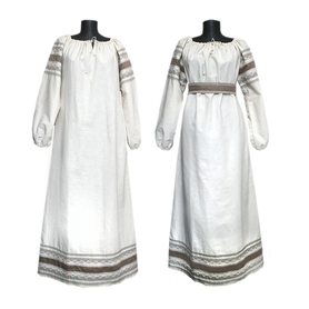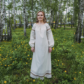Декор платья - жаккардовая тесьма со славянскими символами. Талия немного завышена, пояс в комплекте.