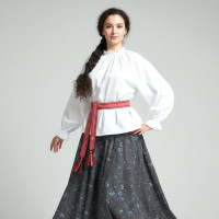 Фасон: Юбка – почти солнце, длиной чуть ниже колена, завышенная талия, рукав реглан, регулируемая горловина, пояс в комплекте.