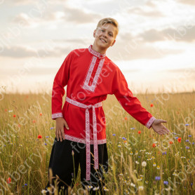 Платье «Дмитра» - современное прочтение славянских традиций. Платье четкого силуэта, чуть ниже колена, чистого яркого цвета. Платье отрезное по талии, длинный рукав-реглан, регулируемая горловина, юбка "почти солнце", с поясом. Для платья подобран эффектный декор -  солярные славянские знаки.  Платье сшито из габардина, ткани, которая не блестит и не мнется, всегда выглядит аккуратно, ярко, празднично, романтично.