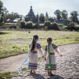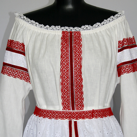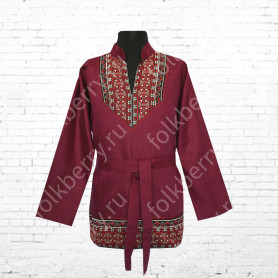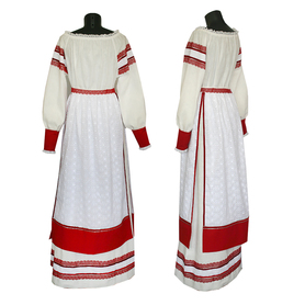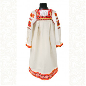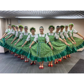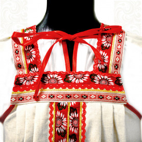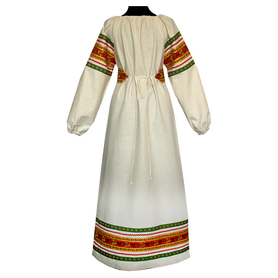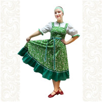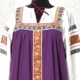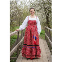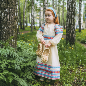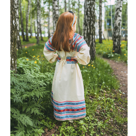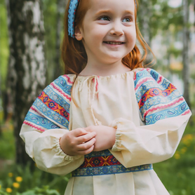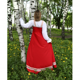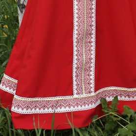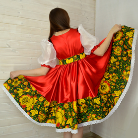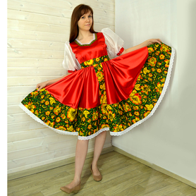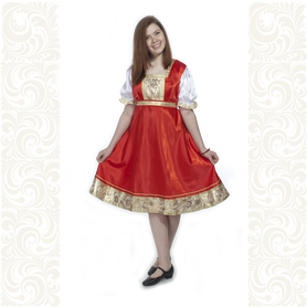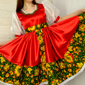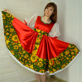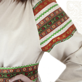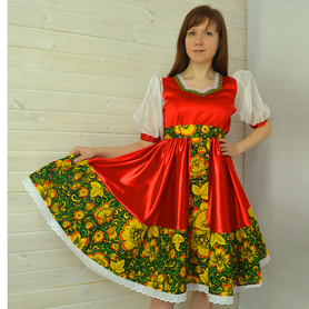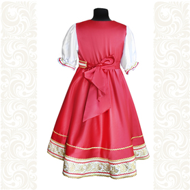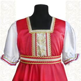 Платье «Солдатка» отрезное по талии, рукав реглан, юбка-почти солнце, длиной немного ниже колена. В комплект входит пояс. Важно, что декор платья выдержан в славянском стиле. Это платье - современное прочтение народных традиций. Женственное, удобное и нарядное, оно дарит ощущение радости и праздника. По стилю замечательно подходит для тематических праздников в детских учебных заведениях, по фасону и яркости цветов отлично подойдет для танцевальных коллективов. как правило, дети не стесняются надевать его ( в отличии от длинного русского сарафана ) Платье выполнено из немнущейся, матовой ткани "габардин" символичных для славян цветов ( красного, синего, зеленого, бордового).