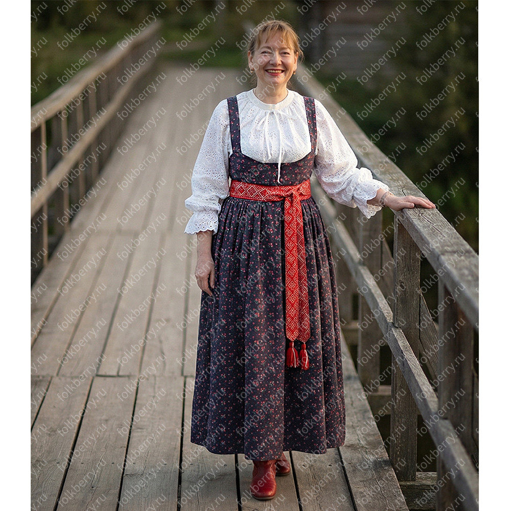 Сарафан: 100% хлопок с историческим синим цветочным принтом восстановленным на Шуйском ткацком производстве;