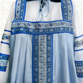 Длинный сарафан с блузой нежных пастельных цветов "Гжельские мотивы" выполнен в традиционном славянском стиле. Синий и голубой цвета - одни из любимых цветов русских девушек. Cарафан украшен жаккардовой тесьмой. Блуза выполнена из хлопка с красивыми вставками из декоративной жаккардовой тесьмы. Бретели сарафана регулируются по длине.