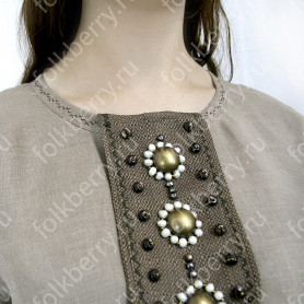 Белая блуза с пышными рукавами из хлопка украшена такой же тесьмой, что и сарафан. Это делает её красивой и праздничной.