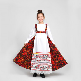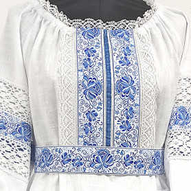 Характерное отличие поневы от любой другой юбки в том, что она обычно изготавливается из трех кусков ткани прямоугольной формы, собранных на общем поясе. Понева выполнена изо льна черного цвета. Каждая часть поневы декорирована жаккардовой тесьмой и вьюнами внизу и по примеру. Примечательно, что широкая тесьма с цветочным узором, выполнена на основе исторического изображения, см. фото. Как правило, поневу надевают на длинную рубаху и подпоясывают тканым славянским поясом или поясом-шнурком.