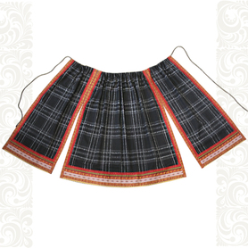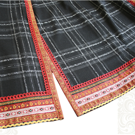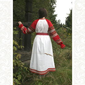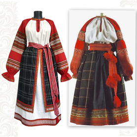 Приталенная модель хорошо сидит по фигуре, расклешенная книзу дает крупные мягкие волны. Сзади расположена застежка «молния». Талия дополнительно подчеркивается поясом. Плечики регулируются по длине. Сарафан украшен широкой полосой из жаккардовой тесьмы, вьюнка, золотистого шнура, кружева.