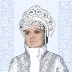 3. Кокошник выполнен из парчи, кружева, страз. К кокошнику прилагаются полупрозрачная фата и длинные бусы-подвески. Высота кокошника 13 см. Сзади ленты-крылья. Кокошник легкий и удобный.