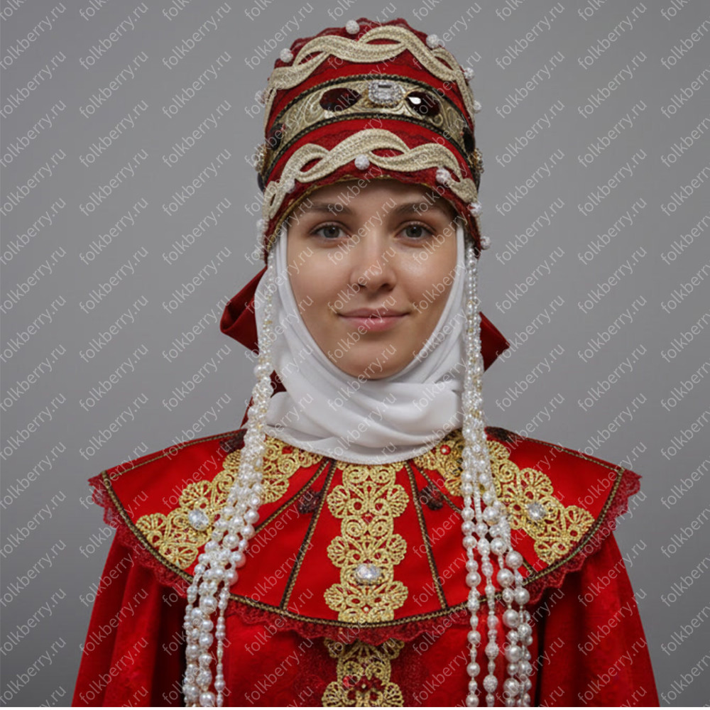 3. Кокошник выполнен из парчи, кружева, страз. К кокошнику прилагаются полупрозрачная фата и длинные бусы-подвески. Высота кокошника 13 см. Сзади ленты-крылья. Кокошник легкий и удобный.