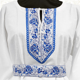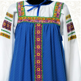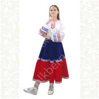Костюм  выполнен из габардина и красиво подобранного декора в золотистых цветах. Достоинства габардина  в том, что он не мнется, не блестит, как атлас, ложится красивыми  мягкими складками, цвет не выгорает. Юбка  с оборкой, декор в золотистых цветах, по талии на  двойной резинке. Блуза  белого праздничного цвета, с баской,  рукава расширены внизу, с манжетами.   Сзади на блузе шнуровка. Она дает хорошую посадку по фигуре. Костюм предназначен для творческих  сольных и коллективных театральных выступлений.